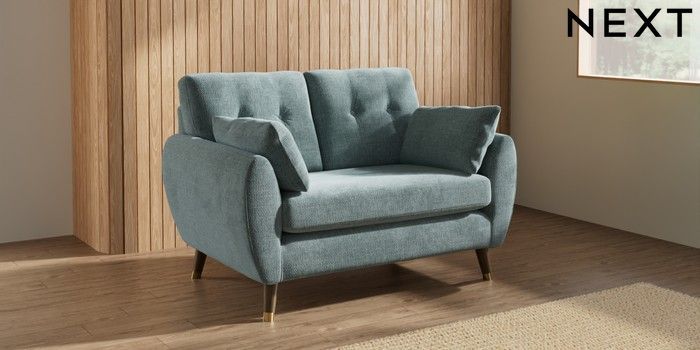 7.3.1 Buy Wilson Buttoned Back 2 Seater Small Sofa Chunky Chenille Light Teal Green Low Retro Tapered Metal Cap - Mid from the Seasons online shop Click here to use our website with more accessibility support, for example screen readers