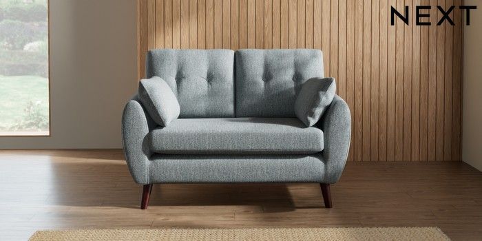 7.3.1 Buy Wilson Buttoned Back 2 Seater Small Sofa Chunky Weave Mid Blue Retro Tapered - Dark Brown from the Seasons online shop Click here to use our website with more accessibility support, for example screen readers