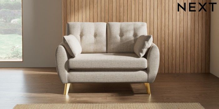 7.3.1 Buy Wilson Buttoned Back 2 Seater Small Sofa Chunky Weave Mid Natural Metal Tapered - Gold from the Seasons online shop Click here to use our website with more accessibility support, for example screen readers