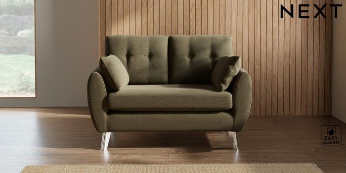 7.3.1 Buy Wilson Buttoned Back 2 Seater Small Sofa Fine Chenille Easy Clean Dark Moss Green Metal Tapered - Chrome from the Seasons online shop Click here to use our website with more accessibility support, for example screen readers