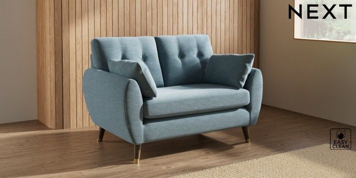 7.3.1 Buy Wilson Buttoned Back 2 Seater Small Sofa Fine Chenille Easy Clean Mid Blue Low Retro Tapered Metal Cap - Mid from the Seasons online shop Click here to use our website with more accessibility support, for example screen readers