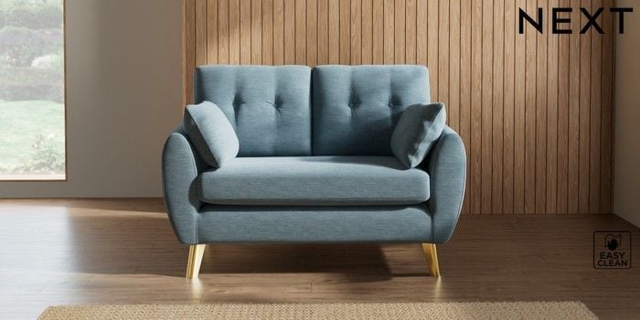 7.3.1 Buy Wilson Buttoned Back 2 Seater Small Sofa Fine Chenille Easy Clean Mid Blue Metal Tapered - Gold from the Seasons online shop Click here to use our website with more accessibility support, for example screen readers