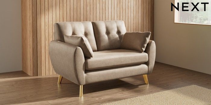 7.3.1 Buy Wilson Buttoned Back 2 Seater Small Sofa Luxe Chenille Mid Camel Beige Metal Tapered - Gold from the Seasons online shop Click here to use our website with more accessibility support, for example screen readers