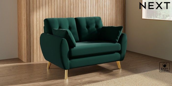 7.3.1 Buy Wilson Buttoned Back 2 Seater Small Sofa Plush Velvet Easy Clean Bottle Green Metal Tapered - Gold from the Seasons online shop