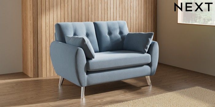 7.3.1 Buy Wilson Buttoned Back 2 Seater Small Sofa Relaxed Linen Look Mid Blue Metal Tapered - Chrome from the Seasons online shop Click here to use our website with more accessibility support, for example screen readers