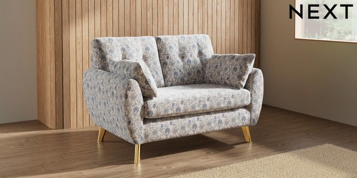 7.3.1 Buy Wilson Buttoned Back 2 Seater Small Sofa Relaxed Linen Look Print Woodblock Floral Blue Metal Tapered - Gold from the Seasons online shop