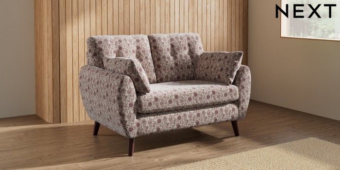 7.3.1 Buy Wilson Buttoned Back 2 Seater Small Sofa Relaxed Linen Look Print Woodblock Floral Print Pink Retro Tapered - Dark Brown from the Seasons online shop