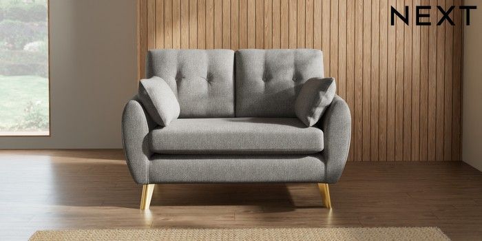 7.3.1 Buy Wilson Buttoned Back 2 Seater Small Sofa Tweedy Chenille Mid Grey Metal Tapered - Gold from the Seasons online shop Click here to use our website with more accessibility support, for example screen readers