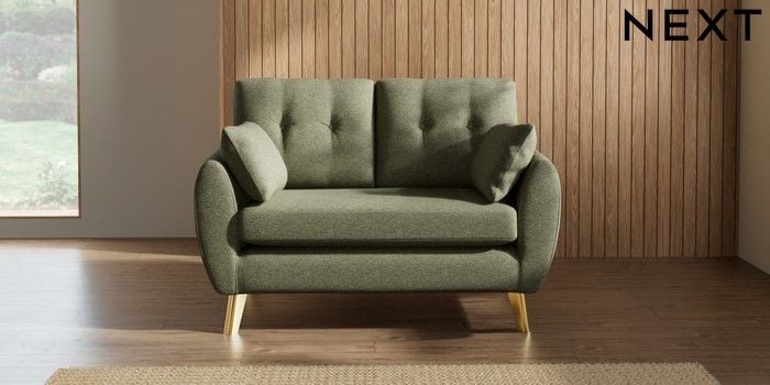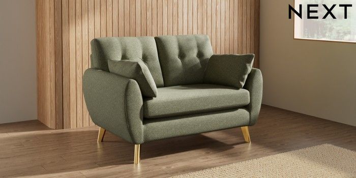 7.3.1 Buy Wilson Buttoned Back 2 Seater Small Sofa Tweedy Chenille Mid Moss Green Metal Tapered - Gold from the Seasons online shop Click here to use our website with more accessibility support, for example screen readers