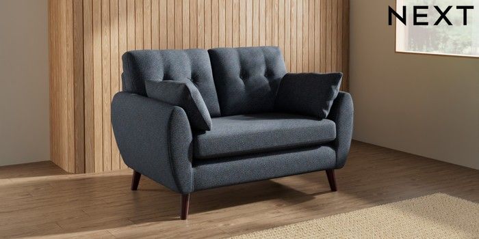 7.3.1 Buy Wilson Buttoned Back 2 Seater Small Sofa Tweedy Chenille Navy Blue Retro Tapered - Dark Brown from the Seasons online shop Click here to use our website with more accessibility support, for example screen readers