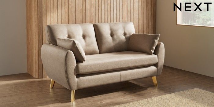 7.3.1 Buy Wilson Buttoned Back 2 Seater Sofa Luxe Chenille Mid Camel Beige Metal Tapered - Gold from the Seasons online shop Click here to use our website with more accessibility support, for example screen readers