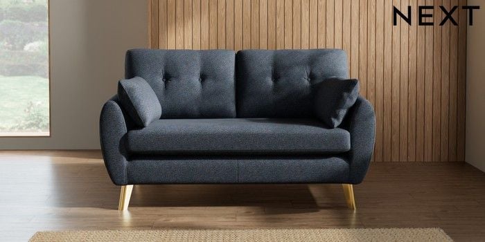 7.3.1 Buy Wilson Buttoned Back 2 Seater Sofa Tweedy Chenille Navy Blue Metal Tapered - Gold from the Seasons online shop Click here to use our website with more accessibility support, for example screen readers
