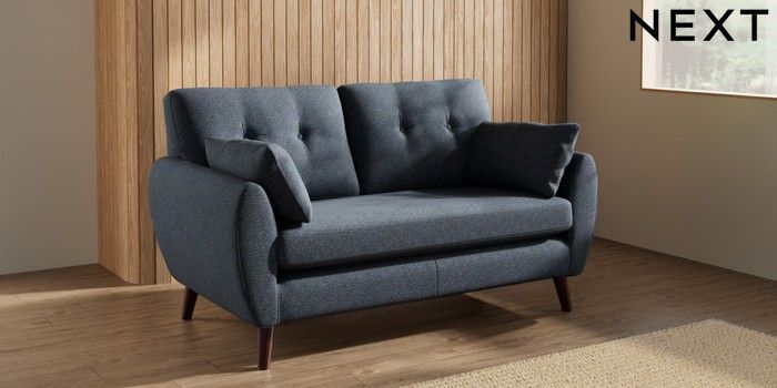 7.3.1 Buy Wilson Buttoned Back 2 Seater Sofa Tweedy Chenille Navy Blue Retro Tapered - Dark Brown from the Seasons online shop Click here to use our website with more accessibility support, for example screen readers