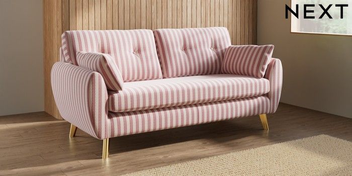 7.3.1 Buy Wilson Buttoned Back 3 Seater Small Sofa Bold Chenille Stripe Dark Pink Metal Tapered - Gold from the Seasons online shop Click here to use our website with more accessibility support, for example screen readers