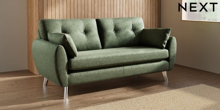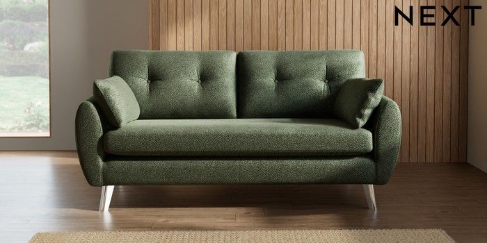 7.3.1 Buy Wilson Buttoned Back 3 Seater Small Sofa Boucle Chenille Dark Moss Green Metal Tapered - Chrome from the Seasons online shop Click here to use our website with more accessibility support, for example screen readers
