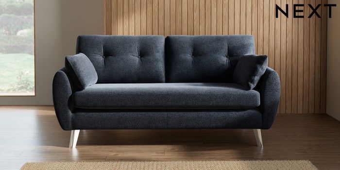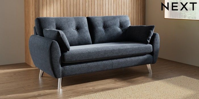 7.3.1 Buy Wilson Buttoned Back 3 Seater Small Sofa Boucle Chenille Dark Slate Blue Metal Tapered - Chrome from the Seasons online shop Click here to use our website with more accessibility support, for example screen readers