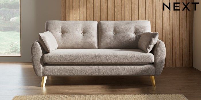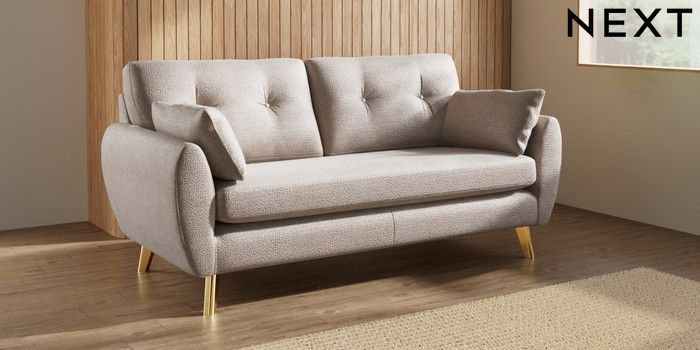 7.3.1 Buy Wilson Buttoned Back 3 Seater Small Sofa Boucle Chenille Light Natural Metal Tapered - Gold from the Seasons online shop Click here to use our website with more accessibility support, for example screen readers