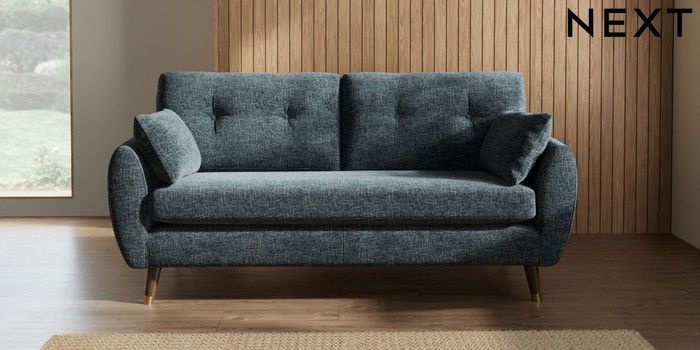 7.3.1 Buy Wilson Buttoned Back 3 Seater Small Sofa Chunky Chenille Dark Navy Blue Low Retro Tapered Metal Cap - Mid from the Seasons online shop Click here to use our website with more accessibility support, for example screen readers