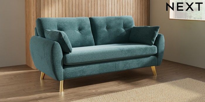 7.3.1 Buy Wilson Buttoned Back 3 Seater Small Sofa Chunky Chenille Mid Teal Green Metal Tapered - Gold from the Seasons online shop Click here to use our website with more accessibility support, for example screen readers