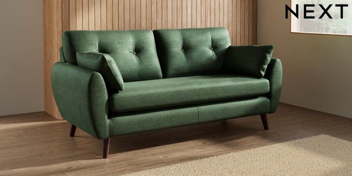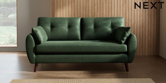 7.3.1 Buy Wilson Buttoned Back 3 Seater Small Sofa Luxe Chenille Dark Green Retro Tapered - Dark Brown from the Seasons online shop Click here to use our website with more accessibility support, for example screen readers