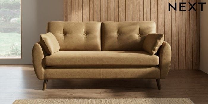 7.3.1 Buy Wilson Buttoned Back 3 Seater Small Sofa Luxe Chenille Honey Yellow Retro Tapered - Mid from the Seasons online shop Click here to use our website with more accessibility support, for example screen readers