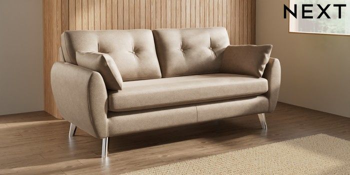 7.3.1 Buy Wilson Buttoned Back 3 Seater Small Sofa Luxe Chenille Mid Camel Beige Metal Tapered - Chrome from the Seasons online shop Click here to use our website with more accessibility support, for example screen readers