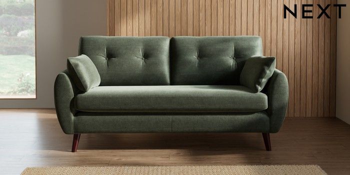 7.3.1 Buy Wilson Buttoned Back 3 Seater Small Sofa Luxe Chenille Mid Green Retro Tapered - Dark Brown from the Seasons online shop Click here to use our website with more accessibility support, for example screen readers