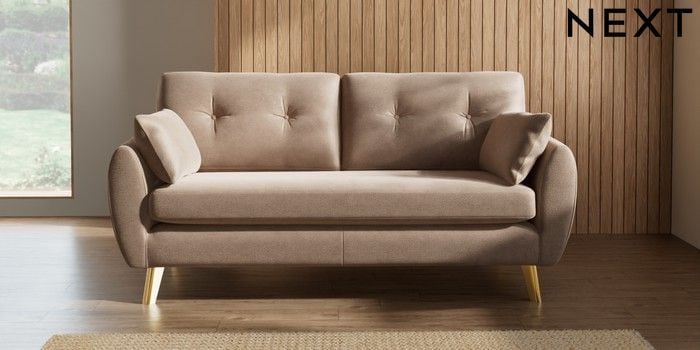 7.3.1 Buy Wilson Buttoned Back 3 Seater Small Sofa Luxe Chenille Mid Natural Metal Tapered - Gold from the Seasons online shop Click here to use our website with more accessibility support, for example screen readers