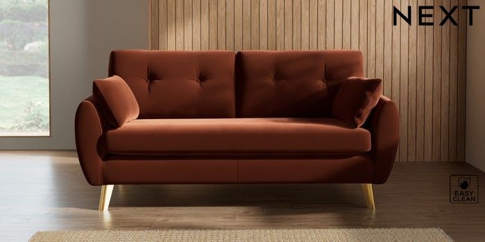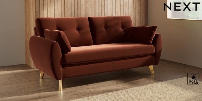 7.3.1 Buy Wilson Buttoned Back 3 Seater Small Sofa Plush Velvet Easy Clean Ginger Orange Metal Tapered - Gold from the Seasons online shop Click here to use our website with more accessibility support, for example screen readers