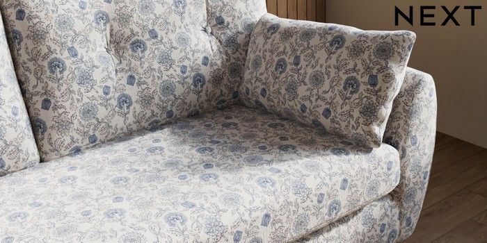 7.3.1 Buy Wilson Buttoned Back 3 Seater Small Sofa Relaxed Linen Look Print Woodblock Floral Blue Metal Tapered - Chrome from the Seasons online shop
