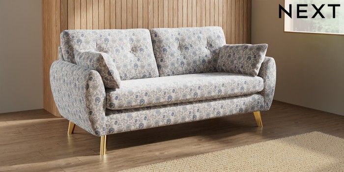7.3.1 Buy Wilson Buttoned Back 3 Seater Small Sofa Relaxed Linen Look Print Woodblock Floral Blue Metal Tapered - Gold from the Seasons online shop