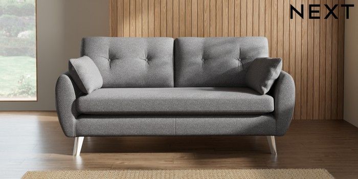 7.2.10 Buy Wilson Buttoned Back 3 Seater Small Sofa Studio Chenille Mid Grey Metal Tapered - Chrome from the Seasons online shop Click here to use our website with more accessibility support, for example screen readers