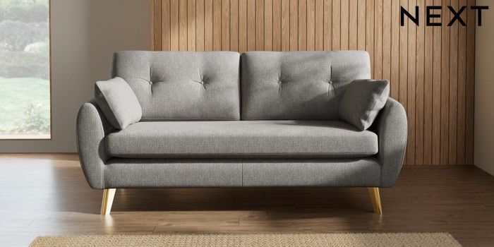 7.3.1 Buy Wilson Buttoned Back 3 Seater Small Sofa Tweedy Chenille Mid Grey Metal Tapered - Gold from the Seasons online shop Click here to use our website with more accessibility support, for example screen readers