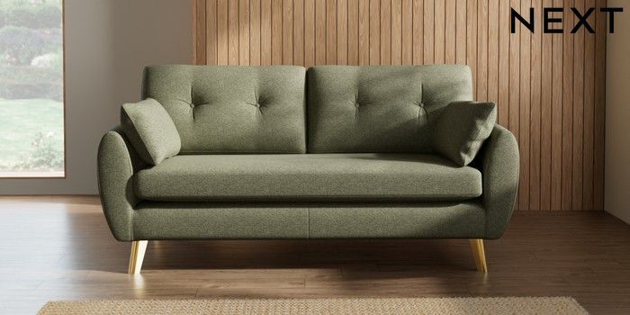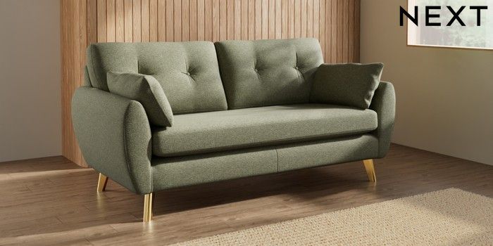 7.3.1 Buy Wilson Buttoned Back 3 Seater Small Sofa Tweedy Chenille Mid Moss Green Metal Tapered - Gold from the Seasons online shop Click here to use our website with more accessibility support, for example screen readers