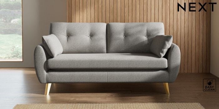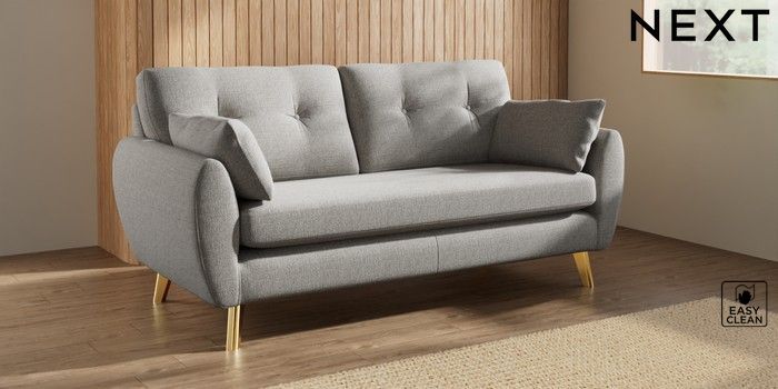7.3.1 Buy Wilson Buttoned Back 3 Seater Small Sofa Woven Chenille Easy Clean Light Grey Metal Tapered - Gold from the Seasons online shop Click here to use our website with more accessibility support, for example screen readers