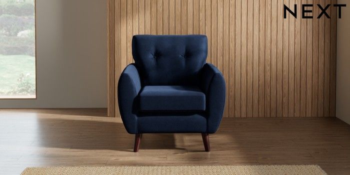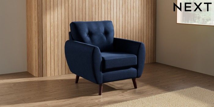 7.3.1 Buy Wilson Buttoned Back Armchair Luxe Chenille Navy Blue Retro Tapered - Dark Brown from the Seasons online shop Click here to use our website with more accessibility support, for example screen readers