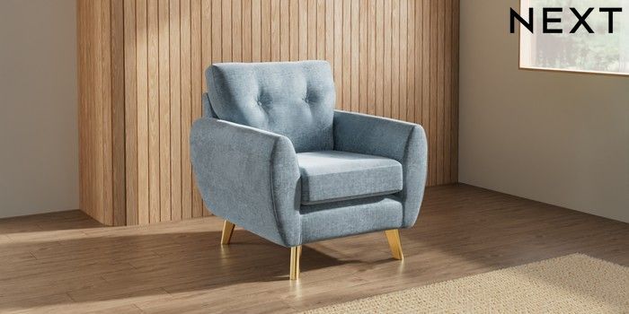 7.3.1 Buy Wilson Buttoned Back Armchair Plush Chenille Light Blue Metal Tapered - Gold from the Seasons online shop Click here to use our website with more accessibility support, for example screen readers