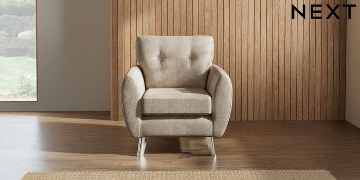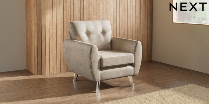 7.3.1 Buy Wilson Buttoned Back Armchair Plush Chenille Light Natural Metal Tapered - Chrome from the Seasons online shop Click here to use our website with more accessibility support, for example screen readers