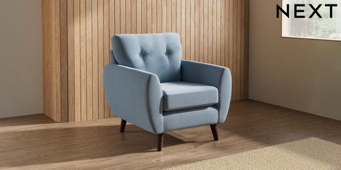 7.3.1 Buy Wilson Buttoned Back Armchair Relaxed Linen Look Mid Blue Retro Tapered - Dark Brown from the Seasons online shop Click here to use our website with more accessibility support, for example screen readers