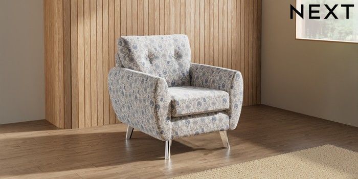 7.3.1 Buy Wilson Buttoned Back Armchair Relaxed Linen Look Print Woodblock Floral Blue Metal Tapered - Chrome from the Seasons online shop