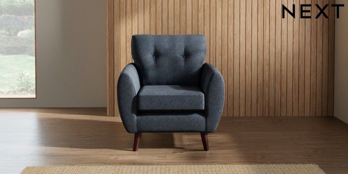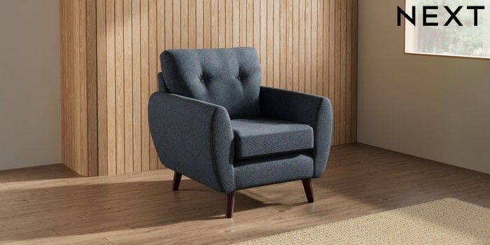 7.3.1 Buy Wilson Buttoned Back Armchair Tweedy Chenille Navy Blue Retro Tapered - Dark Brown from the Seasons online shop Click here to use our website with more accessibility support, for example screen readers