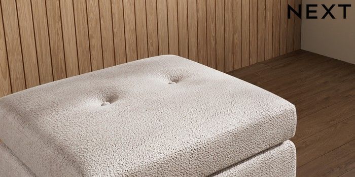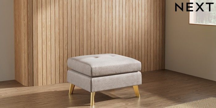 7.3.1 Buy Wilson Buttoned Back Footstool Boucle Chenille Light Natural Metal Tapered - Gold from the Seasons online shop Click here to use our website with more accessibility support, for example screen readers