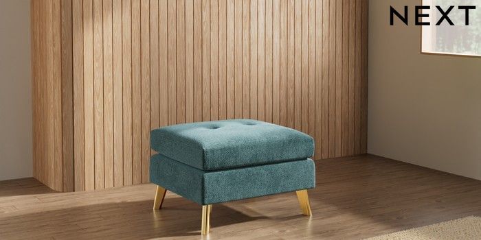 7.3.1 Buy Wilson Buttoned Back Footstool Chunky Chenille Mid Teal Green Metal Tapered - Gold from the Seasons online shop Click here to use our website with more accessibility support, for example screen readers