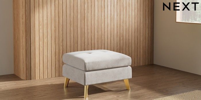 7.3.1 Buy Wilson Buttoned Back Footstool Chunky Chenille Oyster Metal Tapered - Gold from the Seasons online shop Click here to use our website with more accessibility support, for example screen readers