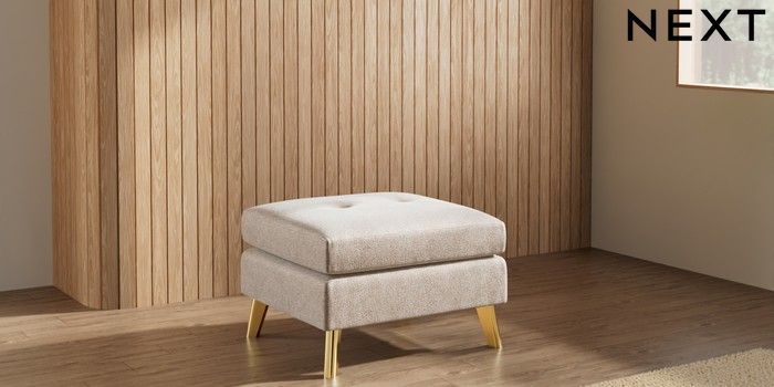7.3.1 Buy Wilson Buttoned Back Footstool Cotswold Chenille Light Natural Metal Tapered - Gold from the Seasons online shop Click here to use our website with more accessibility support, for example screen readers