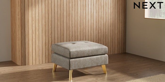 7.3.1 Buy Wilson Buttoned Back Footstool Cotswold Chenille Mid Mink Brown Metal Tapered - Gold from the Seasons online shop Click here to use our website with more accessibility support, for example screen readers
