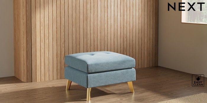 7.3.1 Buy Wilson Buttoned Back Footstool Fine Chenille Easy Clean Mid Blue Metal Tapered - Gold from the Seasons online shop Click here to use our website with more accessibility support, for example screen readers