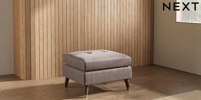 7.3.1 Buy Wilson Buttoned Back Footstool Luxe Chenille Mink Brown Low Retro Tapered Metal Cap - Mid from the Seasons online shop Click here to use our website with more accessibility support, for example screen readers