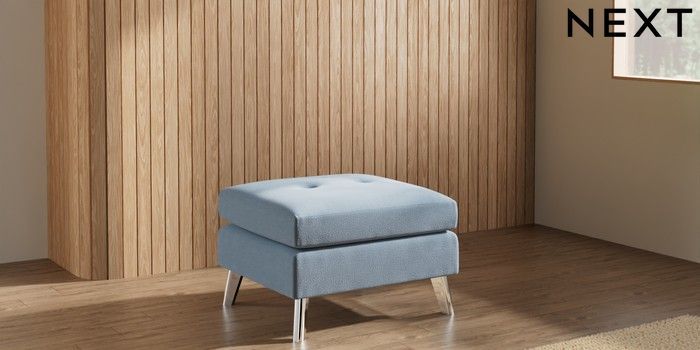7.3.1 Buy Wilson Buttoned Back Footstool Relaxed Linen Look Mid Blue Metal Tapered - Chrome from the Seasons online shop Click here to use our website with more accessibility support, for example screen readers