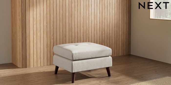 7.3.1 Buy Wilson Buttoned Back Footstool Tweedy Chenille Oyster Retro Tapered - Dark Brown from the Seasons online shop Click here to use our website with more accessibility support, for example screen readers